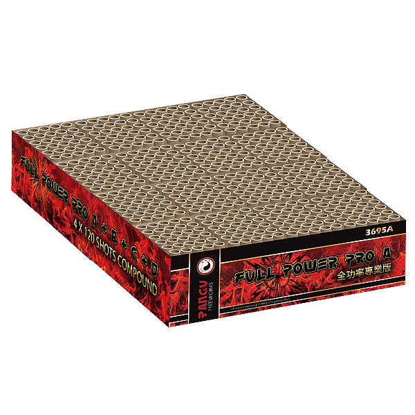 Soms wil je gewoon vol gas gaan.. Gewoon als een echte pro het nieuwe jaar inluiden. Daar heeft Pangu nu een oplossing voor, de Full Power Pro! Met deze compoundset welke is opgebouwd uit vier compounds met ieder 120 schoten siervuurwerk zet jij de buurt op stelten. Je ramt in totaal 480 schoten met het allermooiste siervuurwerk uit verschillende toppers van Pangu producten de hemel in. En dat in een heerlijk tempo boordevol salvos welke elkaar sneller en sneller opvolgen. Niet normaal, wat een blok is dit!